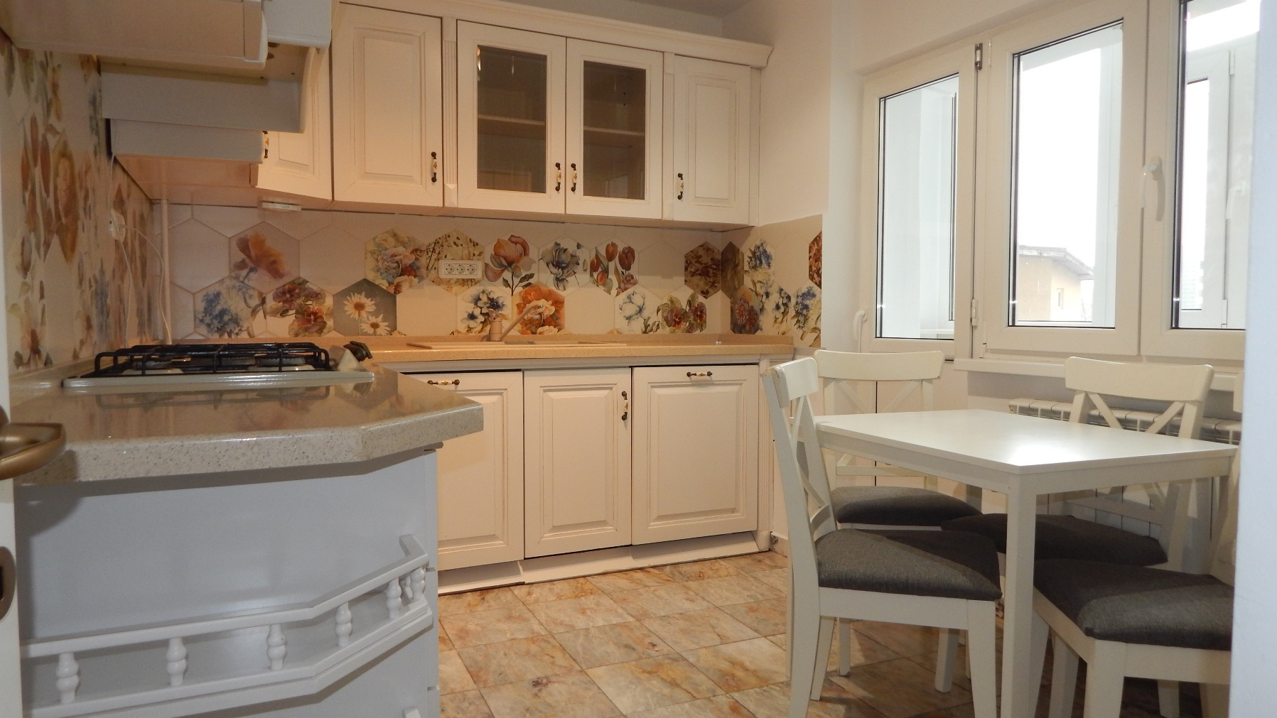 Bucatarie spatioasa, complet mobilata si utilata cu electrocasnice (cuptor, plita, hota, combina frigorifica, masina de spalat rufe si vase). Mobilierul este realizat pe comanda pentru a maximiza spatiul si functionalitatea. Din bucatarie se poate accesa un balcon.