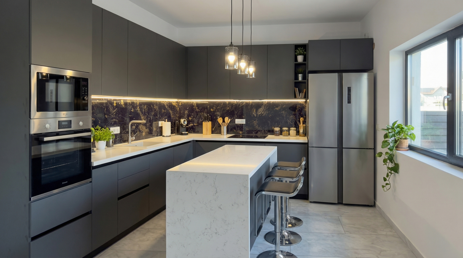 Parterul adună viața de zi cu zi: living luminos, bucătărie open-space și ieșire directă către terasă și curtea generoasă, cu peste 300 mp liberi. Un spațiu unde liniștea, joaca și serile în familie își găsesc locul.