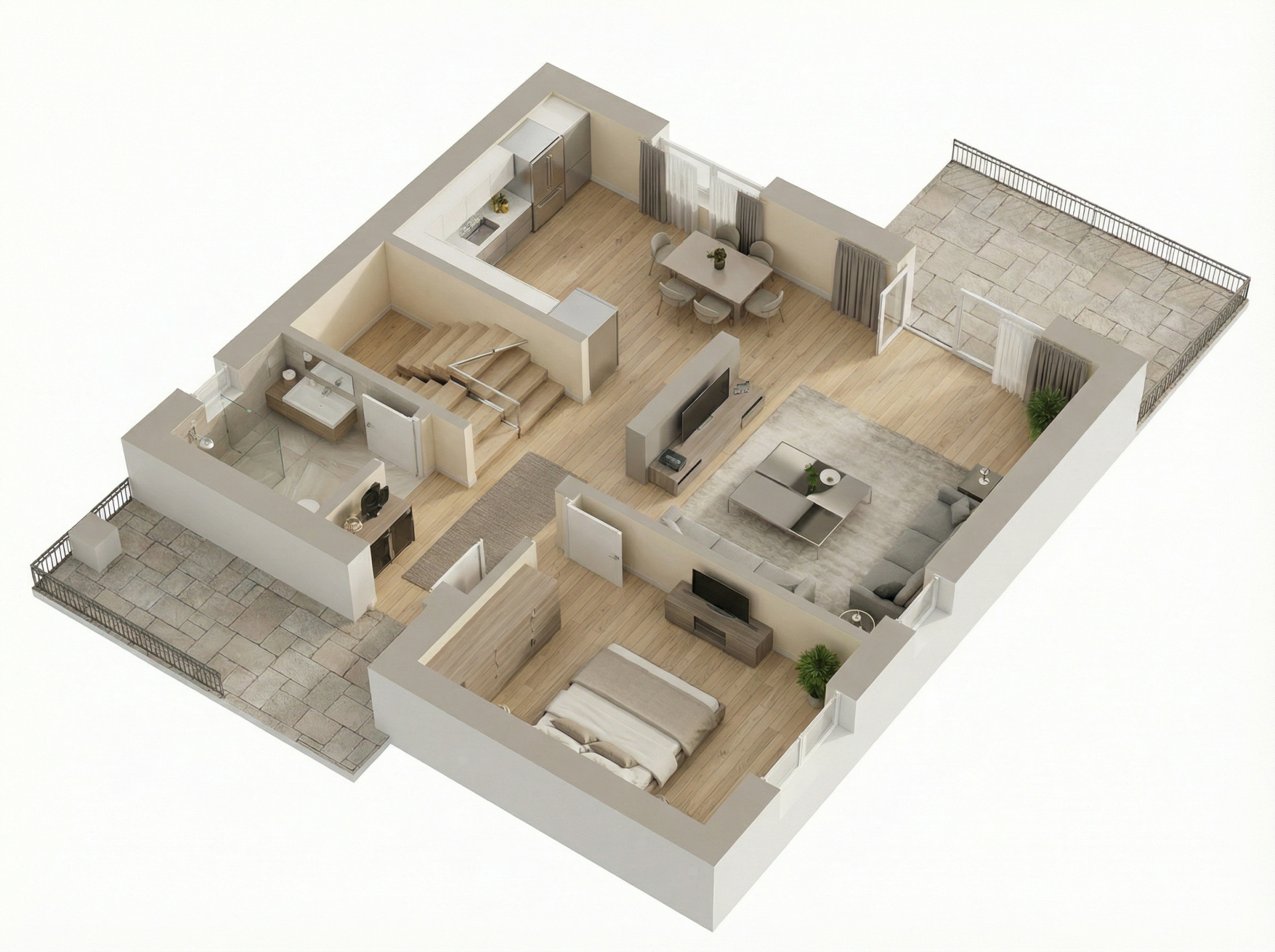 La etaj, patru dormitoare, trei băi cu geam și un balcon creează zona de intimitate. Scara interioară solidă leagă armonios cele două niveluri.