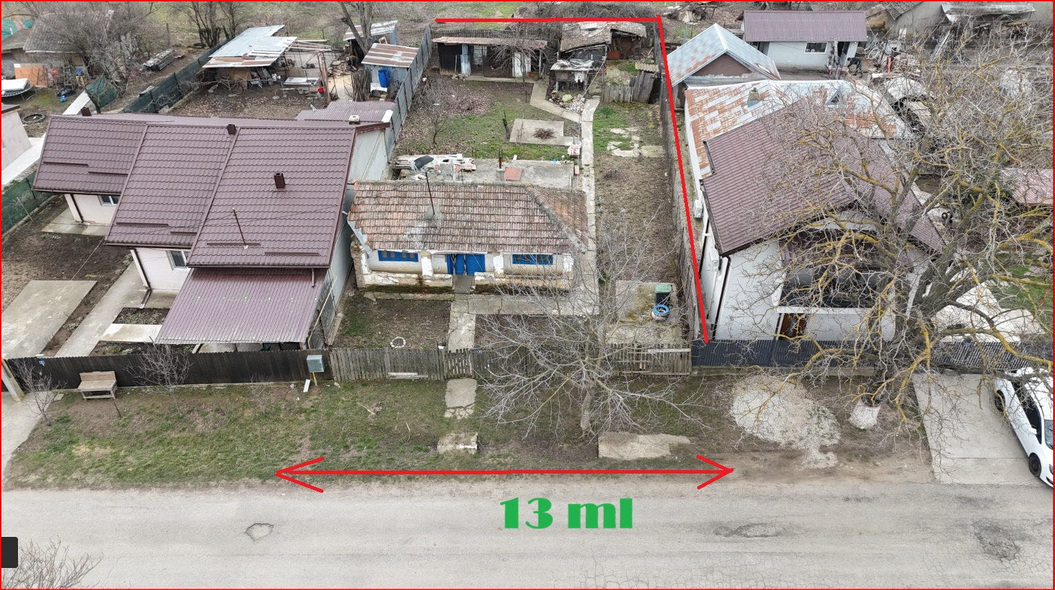 Terenul beneficiază de front stradal de 13 ml, lungime de aproximativ 30 ml, iar lățimea în partea din spate este de 15 ml, oferind o formă avantajoasă pentru construirea unei case.