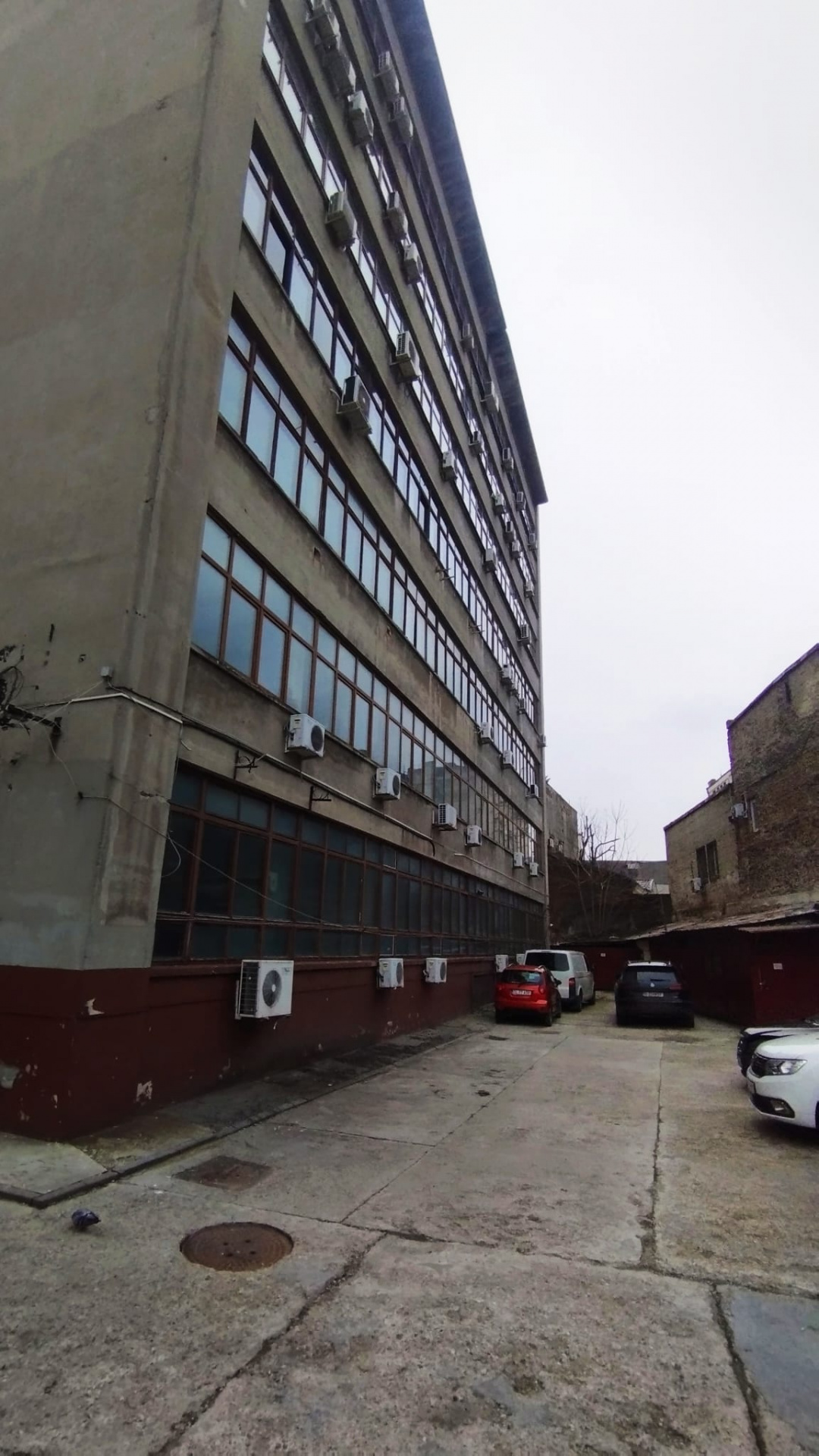 Clădirea de birouri este compusă din două corpuri principale și construcții anexe (depozite, garaje, cabină poartă).